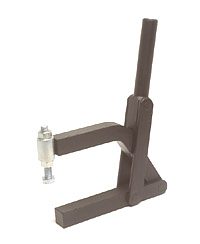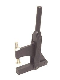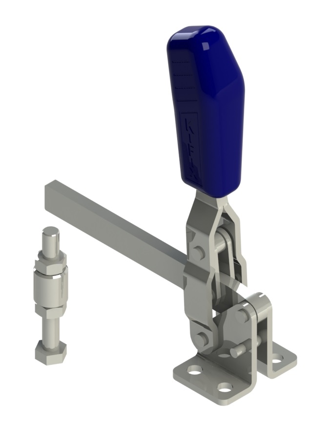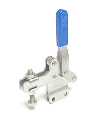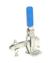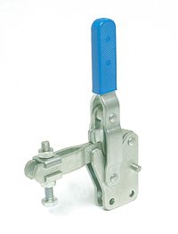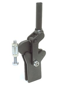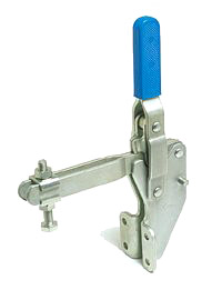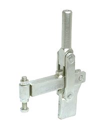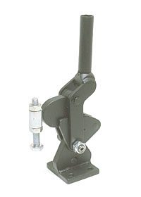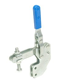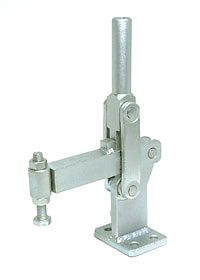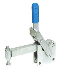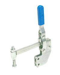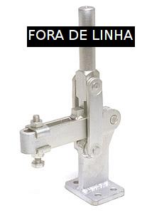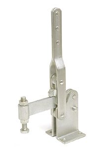 | Os Presilhas com ação de cotovelo tipo vertical são os mais utilizados nas operações de fixação, sendo identificados pelo cabo na posição vertical. O cabo e a haste de travamento funcionam simultaneamente. A principal característica deste tipo de grampo é que o cabo se movimenta a uma pequena distância da barra de travamento, possibilitando uma fixação rápida. A haste de travamento "abre" um mínimo de 90° e pode ser sólida ou dobrada em forma de "U". A placa-base pode ser plana ou reta (versão R). |