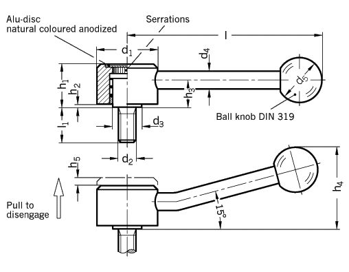 The overall height is reduced to a minimum. The alu-disc gives these levers a good appearance. As all other adjustable levers, they are ideal when-ever parts have to be clamped in a confined space, or a particular lever position is required. The threaded insert is connected with the hub via serrations which can be disengaged. Pulling the lever, disengages the serrations and the lever can be swivelled to the ideal clamping position. On releasing the lever it will automatically re-engage. |