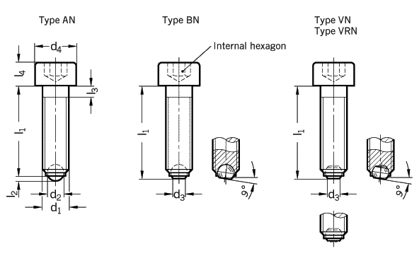 The flat faced moving ball (Type BN) allows a clamping or supporting of non parallel surfaces. The ball of type VN/VRN can be swivelled to a "maximum of 9 to ensure that clamping is always maintained on the flat section of the ball. St. Steel-Ball point screws GN 605 |