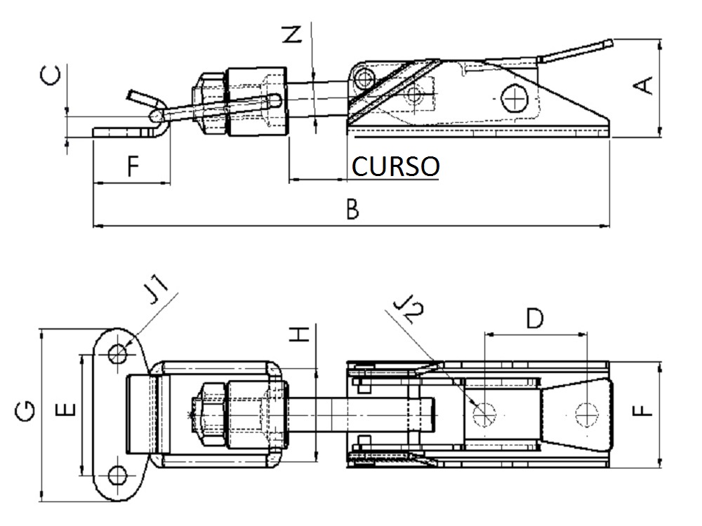 | REFERÊNCIA | FORÇA RETENÇÂO kgf | CURSO | A | B | C | D | E | F | G | H | J1 | J2 | N | PESO kg |